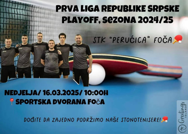 Iz „Perućice“ su pozvali ljubitelje stonog tenisa i sporta da dođu u Gradsku dvoranu i pomognu fočanskim stonotensierima da zadrže prvo mjesto i plasiraju se u Premijer ligu.