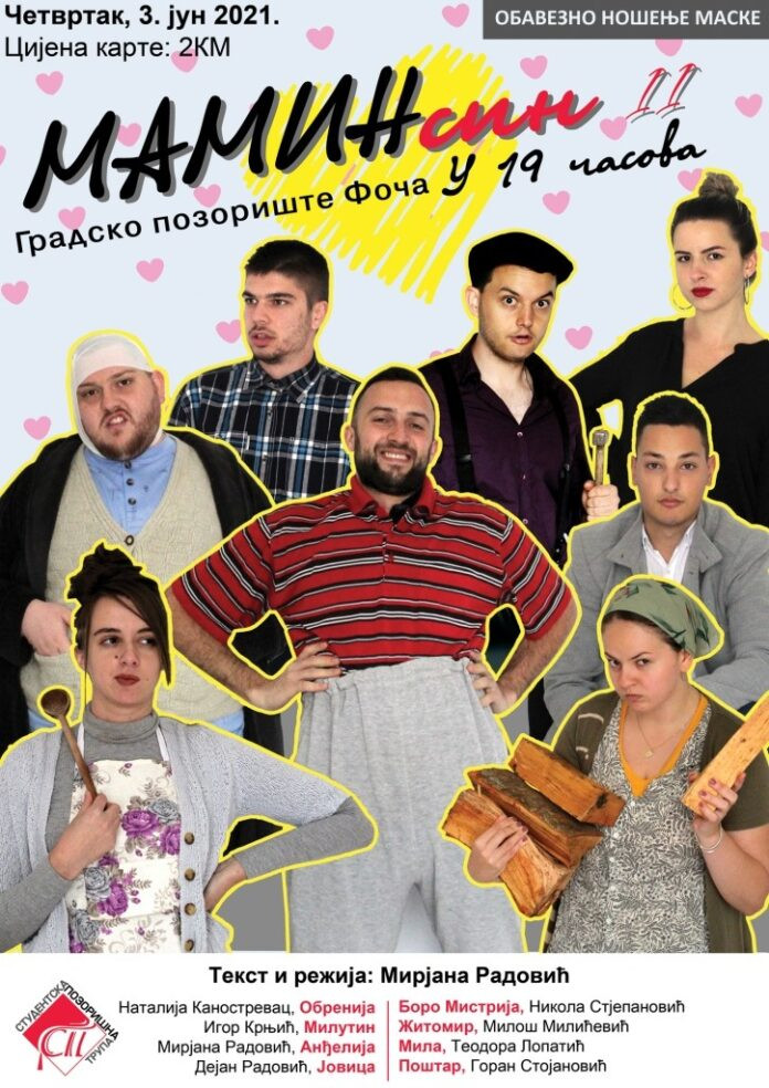 Na sceni Gradskog pozorišta Foča sutra će glumci fočanske Studentske pozorišne trupe premijerno odigrati komediju „Mamin sin II“, rađenu po tekstu i u režiji Mirjane Radović.
