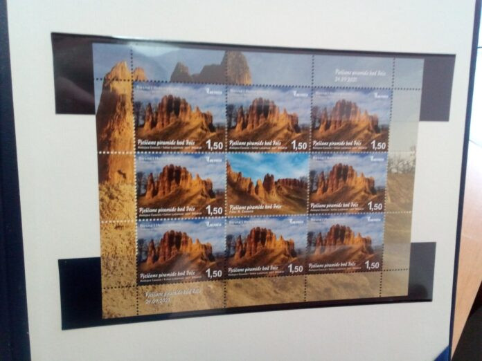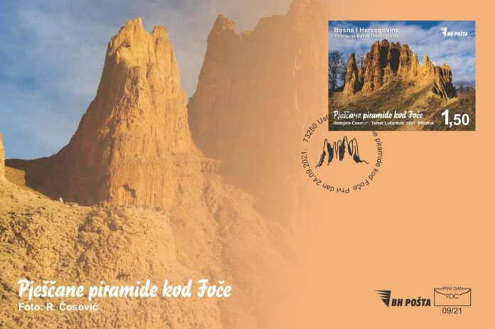 Ćosović priča da je posredstvom Turističke organizacije Foča, „BH Pošti“ poslao petnaestak fotografija Pješčanih piramida, a da su se na markicama našle dvije, te isječak jedne na koverti.