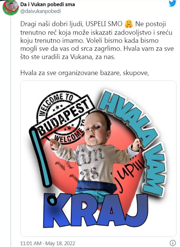 Zahvaljujući njima, Vukan je krenuo gotovo u posljednjem trenutku za Budimpeštu, kako bi primio najskuplji lijek na svijetu i pobijedio spinalnu mišićnu atrofiju.