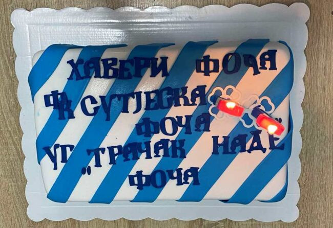 Navijači i fudbaleri “Sutjeske” svojim novim prijateljima poklonili su ikonu Bogorodice, a domaćin ih je dočekao plavo-bijelom tortom sa svjećicom broj 27.