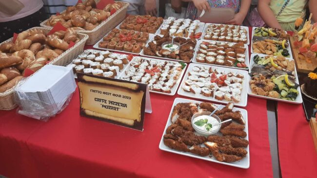Velika gužva bila je i na štandu Kafe picerije „Mocart“. Šarenilo boja i ukusa- rolovana piletina sa prelivom, pileći „Kordon blu“, pohovani palačinci, slani feta palačinci, pastrmka, losos, oslić, lignje, panakote, voćni kolači, neobične čokoladne grane, peciva…