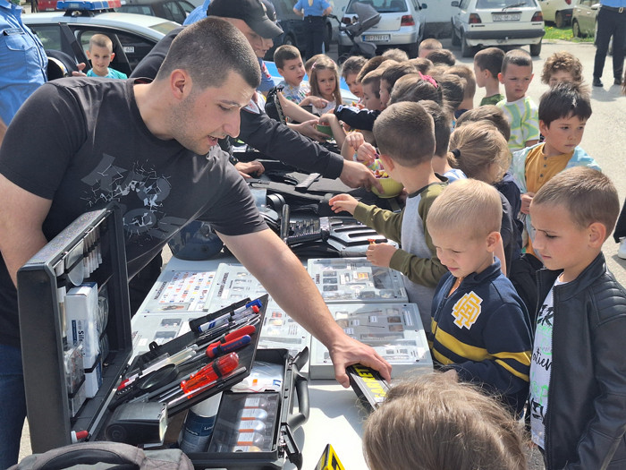 Pažnju mališana iz Dječijeg vrtića „Čika Jova Zmaj“ posebno su privukla policijska vozila. Mnogi su srećni što su dobili priliku nakratko da sjednu za volan i uključe sirene.